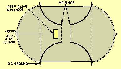 The overall action of the tr and atr circuits depends upon the impedance characteristics of the quarter-wavelength section of transmission line. A quarter-wavelength, or an odd multiple of the quarter-wavelength, transmission line presents opposite impedance values at the ends; one end of the line appears as a short and the other end appears as an open. TR Tube The type of spark gap used as a tr tube may vary. It may be one that is simply formed by two electrodes placed across the transmission line; or it may be one enclosed in an evacuated glass envelope with special features to improve operation. The requirements of the spark gap are (1) high impedance prior to the arc and (2) very low impedance during arc time. At the end of the transmitted pulse the arc should be extinguished as rapidly as possible. Extinguishing the arc stops any loss caused by the arc and permits signals from nearby targets to reach the receiver. The simple gap formed in air has a resistance during conduction of from 30 to 50 ohms. This is usually too high for use with any but an open-wire transmission line. The time required for the air surrounding the gap to completely deionize after the pulse voltage has been removed is about 10 microseconds. During this time the gap acts as an increasing resistance across the transmission line to which it is connected. However, in a tr system using an air gap, the echo signals reaching the receiver beyond the gap will be permitted to increase to half their proper magnitude 3 microseconds after the pulse voltage has been removed. This interval is known as RECOVERY TIME. Tr tubes are usually conventional spark gaps enclosed in partially evacuated, sealed glass envelopes, as shown in figure 2-13. The arc is formed as electrons are conducted through the ionized gas or vapor. You may lower the magnitude of voltage necessary to break down a gap by reducing the pressure of the gas that surrounds the electrodes. Optimum pressure achieves the most efficient tr operation. You can reduce the recovery time, or DEIONIZATION TIME, of the gap by introducing water vapor into the tr tube. A tr tube containing water vapor at a pressure of 1 millimeter of mercury will recover in 0.5 microseconds. It is important for a tr tube to have a short recovery time to reduce the range at which targets near the radar can be detected. If, for example, echo signals reflected from nearby objects return to the radar before the tr tube has recovered, those signals will be unable to enter the receiver. Figure 2-13. - Tr tube with keep-alive electrode.