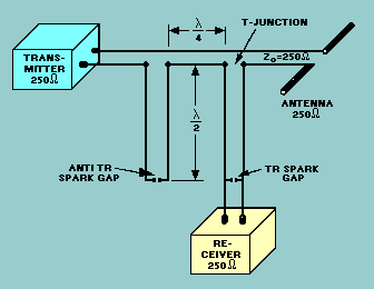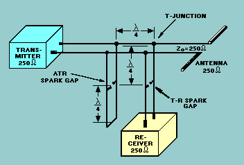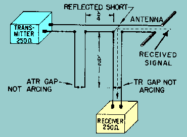 ATR Tube The atr tube is usually a simpler device than a tr tube. An atr tube might use a pure inert gas, such as argon, because recovery time generally is not a vital factor. Furthermore, a priming agent, such as keep-alive voltage, is not needed. The absence of either a chemically active gas or a keep-alive voltage results in atr tubes having longer useful lives than tr tubes. Tr and atr tubes may contain radioactive material. Handle with care to avoid breakage and possible contamination. There are two basic tr-atr duplexer configurations. They are the parallel-connected and the series-connected duplexer systems. The following paragraphs describe the operation of both systems. Parallel Connected Duplexer Operation First, let's consider a PARALLEL-CONNECTED DUPLEXER system, as shown in figure 2-14. The tr spark gap shown in figure 2-14 is located in the receiver coupling line one-quarter wavelength from the T-junction. A half-wavelength, closed-end section of transmission line, called a STUB, is shunted across the main transmission line. An atr spark gap is located in this line one-quarter wavelength from the main transmission line and one-quarter wavelength from the closed end of the stub. As shown in the figure, antenna impedance, line impedance, and transmitter output impedance, when transmitting, are all equal. The action of the circuit during transmission is shown in figure 2-15. Figure 2-14. - Parallel-connected duplexer showing distance and impedance.