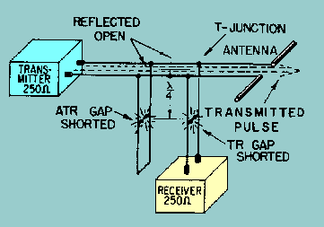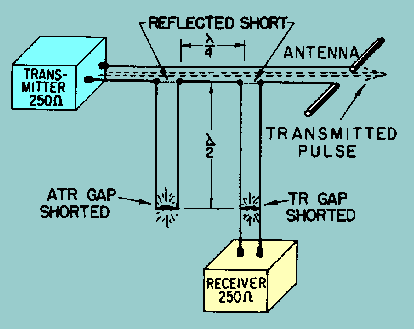 Series-Connected Duplexer Operation In the SERIES-CONNECTED DUPLEXER SYSTEM, shown in figure 2-17, the tr spark gap is located one-half wavelength from the receiver T-junction. The atr spark gap is located one-half wavelength from the transmission line and three-quarters wavelength from the receiver T-junction. During transmission, the tr and atr gaps fire in the series-connected duplexer system, as shown in figure 2-18. This causes a short-circuit to be reflected at the series connection to the main transmission line one-half wavelength away. The transmitted pulse "sees" a low impedance path in the direction of the antenna and does not go into the atr stub or the receiver. Figure 2-17. - Series-connected duplexer showing distance and impedance.