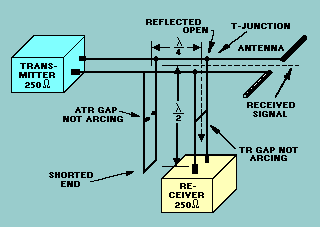 During the transmitting pulse, an arc appears across both spark gaps and causes the tr and atr circuits to act as shorted (closed-end) quarter-wave stubs. The circuits then reflect an open circuit to the tr and atr circuit connections to the main transmission line. None of the transmitted energy can pass through these reflected opens into the atr stub or into the receiver. Therefore, all of the transmitted energy is directed to the antenna. During reception, as shown in figure 2-16, the amplitude of the received echo is not sufficient to cause an arc across either spark gap. Under this condition, the atr circuit now acts as a half-wave transmission line terminated in a short-circuit. This is reflected as an open circuit at the receiver T-junction, three-quarter wavelengths away. The received echo sees an open circuit in the direction of the transmitter. However, the receiver input impedance is matched to the transmission line impedance so that the entire received signal will go to the receiver with a minimum amount of loss. Figure 2-16. - Parallel-connected duplexer during reception.
