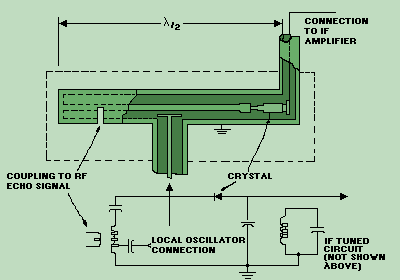 amplifier as the receiver front end; they simply send the echo signal directly to a crystal mixer stage. A crystal is used rather than an electron-tube diode because, at microwave frequencies, the tube would generate excessive noise. Electron tubes are also limited by the effects of transit time at microwave frequencies. The crystal most commonly used is the point-contact crystal diode; however, recent developments in the field of solid-state microwave devices may soon replace the point-contact diode with devices that produce even less noise.">