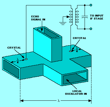 Mixer Many older radar receivers do not use a low-noise amplifier as the receiver front end; they simply send the echo signal directly to a crystal mixer stage. A crystal is used rather than an electron-tube diode because, at microwave frequencies, the tube would generate excessive noise. Electron tubes are also limited by the effects of transit time at microwave frequencies. The crystal most commonly used is the point-contact crystal diode; however, recent developments in the field of solid-state microwave devices may soon replace the point-contact diode with devices that produce even less noise. The Schottky-barrier diode is an example of a relatively recent development that produces less noise than the point-contact crystal. The simplest type of radar mixer is the SINGLE ENDED or UNBALANCED CRYSTAL MIXER, shown in figure 2-24. The mixer illustrated uses a tuned section of coaxial transmission line one-half wavelength long. This section matches the crystal to the signal echo and the local oscillator inputs. Local oscillator injection is accomplished by means of a probe. In the coaxial assembly, the signal is injected by means of a slot. This slot would normally be inserted in the duplexer waveguide assembly and be properly oriented to provide coupling of the returned signal. In this application, the unwanted signals at the output of the mixer (carrier frequency, the local oscillator frequency, and sum of these two signals) are effectively eliminated by a resonant circuit tuned to the intermediate, or difference frequency. One advantage of the unbalanced crystal mixer is its simplicity. It has one major disadvantage; its inability to cancel local oscillator noise. Difficulty in detecting weak signals will exist if noise is allowed to pass through the mixer along with the signal. Figure 2-24. - Single-ended crystal mixer.