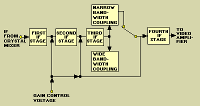 A difference in phase exists between echo signals applied across the two crystals. The signal applied to the crystals from the local oscillator is in phase. Therefore, at some point both signals applied to crystal #1 will be in phase, and the signals applied to crystal #2 will be out of phase. This means that an IF signal of one polarity will be produced across crystal #1 and an IF signal of the opposite polarity will be produced across crystal #2. When these two signals are applied to the balanced output transformer (figure 2-25), they will add. Outputs of the same polarity will cancel across the balanced transformer. This action eliminates the noise of the local oscillator. Noise components introduced from the local oscillator are in phase across the crystals and are, therefore, cancelled in the balanced transformer. The rf characteristics of the crystals must be nearly equal, or the noise of the local oscillator will not completely cancel. Note that only the noise produced by the local oscillator is canceled. Noise arriving with the echo signal is not affected. IF Amplifier Stage The IF AMPLIFIER SECTION of a radar receiver determines the gain, signal-to-noise ratio, and effective bandwidth of the receiver. The typical IF amplifier (commonly called an IF strip) usually contains from three to ten amplifier stages. The IF amplifier has the capability to vary both the bandpass and the gain of a receiver. Normally, the bandpass is as narrow as possible without affecting the actual signal energy. When a selection of pulse widths is available, such as short and long pulses, the bandpass must be able to match the bandwidth of the two different signals. Gain must be variable to provide a constant voltage output for input signals of different amplitudes. Figure 2-27 is a block diagram of an IF amplifier that meets these requirements. Figure 2-27. - IF amplifier block diagram.