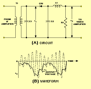 The most critical stage of the IF section is the input (first stage). The quality of this stage determines the noise figure of the receiver and the performance of the entire receiving system with respect to detection of small objects at long ranges. Gain and bandwidth are not the only considerations in the design of the first IF stage. A consideration perhaps of more importance is noise generation. Noise generation in this stage must be low. Noise generated in the input IF stage will be amplified by succeeding stages and may exceed the echo signal in strength. The detector in a microwave receiver serves to convert the IF pulses into video pulses. After amplification, these are applied to the indicator. The simplest form of detector, and the one most commonly used in microwave receivers, is the DIODE DETECTOR. A diode detector circuit is shown in view A of figure 2-28. The secondary of T1 and C1 form a tuned circuit that is resonant at the intermediate frequency. Should an echo pulse of sufficient amplitude be received, the voltage (ei) developed across the tuned circuit is an IF pulse. Its shape is indicated by the dashed line in view B. Positive excursions of e i cause no current to flow through the diode. However, negative excursions result in a flow of diode current and a subsequent negative voltage (eo) to be developed across R1 and C2. Between peak negative voltage excursions of the ei wave, capacitor C2 discharges through R1. Thus, the eo waveform is a negative video pulse with sloping edges and superimposed IF ripple, as indicated by the solid line in view B. A negative polarity of the output pulse is ordinarily preferred, but a positive pulse may be obtained by reversing the connections of the diode. In view A, inductance L1, in combination with wiring capacitance and C2, forms a low-pass filter. This filter attenuates the IF components in the eo waveform but results in a minimum loss of video high-frequency components. Figure 2-28. - Diode detector.