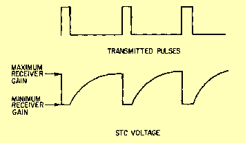 RECEIVER SPECIAL CIRCUITS The performance efficiency of radar receivers is often greatly decreased by interference from one or more of several possible sources. Weather and sea return are the most common of these interference sources, especially for radar systems that operate above 3,000 megahertz. Unfavorable weather conditions can completely mask all radar returns and render the system useless. Electromagnetic interference from external sources, such as the deliberate interference by an enemy, called jamming or electronic counter measures (ECM), can also render a radar system useless. Many special circuits have been designed to help the radar receiver counteract the effects of external interference. These circuits are called VIDEO ENHANCEMENT FEATURES, ANTIJAMMING CIRCUITS, or ELECTRONIC COUNTER-COUNTERMEASURES (ECCM) CIRCUITS. This section will discuss, in general terms, some of the more common video enhancement features associated with radar receivers. Automatic Gain Control (AGC) Most radar receivers use some means to control the overall gain. This usually involves the gain of one or more IF amplifier stages. Manual gain control by the operator is the simplest method. Usually, some more complex form of automatic gain control (agc) or instantaneous automatic gain control (iagc) is used during normal operation. Gain control is necessary to adjust the receiver sensitivity for the best reception of signals of widely varying amplitudes. Agc and iagc circuits are designed with, a shut-off feature so that receiver gain may be adjusted manually. In this way, manual gain control can be used to adjust for best reception of a particular signal. The simplest type of agc adjusts the IF amplifier bias (and gain) according to the average level of the received signal. Agc is not used as frequently as other types of gain control because of the widely varying amplitudes of radar return signals. With agc, gain is controlled by the largest received signals. When several radar signals are being received simultaneously, the weakest signal may be of greatest interest. Iagc is used more frequently because it adjusts receiver gain for each signal. The iagc circuit is essentially a wide-band, dc amplifier. It instantaneously controls the gain of the IF amplifier as the radar return signal changes in amplitude. The effect of iagc is to allow full amplification of weak signals and to decrease the amplification of strong signals. The range of iagc is limited, however, by the number of IF stages in which gain is controlled. When only one IF stage is controlled, the range of iagc is limited to approximately 20 dB. When more than one IF stage is controlled, iagc range can be increased to approximately 40 dB. Sensitivity Time Control (STC) In radar receivers, the wide variation in return signal amplitudes make adjustment of the gain difficult. The adjustment of receiver gain for best visibility of nearby target return signals is not the best adjustment for distant target return signals. Circuits used to adjust amplifier gain with time, during a single pulse-repetition period, are called stc circuits. Sensitivity time-control circuits apply a bias voltage that varies with time to the IF amplifiers to control receiver gain. Figure 2-29 shows a typical stc waveform in relation to the transmitted pulse. When the transmitter fires, the stc circuit decreases the receiver gain to zero to prevent the amplification of any leakage energy from the transmitted pulse. At the end of the transmitted pulse, the stc voltage begins to rise, gradually increasing the receiver gain to maximum. The stc voltage effect on receiver gain is usually limited to approximately 50 miles. This is because close-in targets are most likely to saturate the receiver; beyond 50 miles, stc has no affect and the receiver operates normally. Figure 2-29. - Stc voltage waveform.