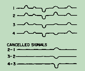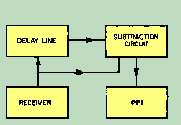 in radar use for the Navy? SPECIAL RECEIVERS The basic receiver of a radar system often does not meet all the requirements of the radar system, nor does it always function very well in unfavorable environments. Several special receivers have been developed to enhance target detection in unfavorable environments or to meet the requirements of special transmission or scanning methods. A radar system with a moving target indicator (mti) system or a monopulse scanning system requires a special type of receiver. Other types of special receivers, such as the logarithmic receiver, have been developed to enhance reception during unfavorable conditions. These receivers will be discussed in general terms in this section. Moving Target Indicator (mti) System The MOVING TARGET INDICATOR (mti) system effectively cancels CLUTTER (caused by fixed unwanted echoes) and displays only moving target signals. Clutter is the appearance on a radar indicator of confusing, unwanted echoes which interfere with the clear display of desired echoes. Clutter is the result of echoes from land, water, weather, and so forth. The unwanted echoes can consist of GROUND CLUTTER (echoes from surrounding land masses), SEA CLUTTER (echoes from the irregular surface of the sea), or echoes from the clouds and rain. The problem is to find the desired echo in the midst of the clutter. To do this, the mti system must be able to distinguish between fixed and moving targets and then must eliminate only the fixed targets. This is accomplished by phase detection and pulse-to-pulse comparison. Target echo signals from stationary objects have the same phase relationship from one receiving period to the next. Moving objects produce echo signals that have a different phase relationship from one receiving period to the next. This principle allows the mti system to discriminate between fixed and moving targets. Signals received from each transmitted pulse are delayed for a period of time exactly equal to the pulse-repetition time. The delayed signals are then combined with the signals received from the next transmitted pulse. This is accomplished in such a manner that the amplitudes subtract from each other as shown in figure 2-30, views Aand B. Since the fixed targets have approximately the same amplitude on each successive pulse, they will be eliminated. The moving target signals, however, are of different amplitudes on each successive pulse and, therefore, do not cancel. The resulting signal is then amplified and presented on the indicators. Figure 2-30A. - Fixed target cancellation.