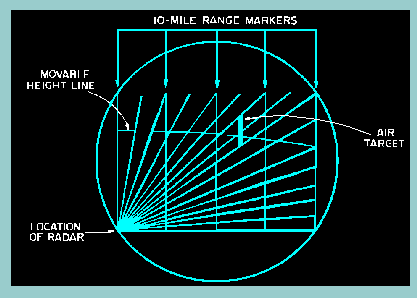 INTRODUCTION Radar systems require an antenna to both transmit and receive radar energy and an indicator system to display the video information generated. This chapter will briefly describe some commonly used indicators and antenna systems. Antenna systems are described in more detail in NEETS, Module 10, Introduction to Wave Generation, Transmission Lines, and Antennas, and Module 11, Microwave Principles. RADAR INDICATORS The information available from a radar receiver may contain as many as several million separate data bits per second. From these and other data, such as the orientation of the antenna, the indicator should present to the observer a continuous, easily understandable, graphic picture of the relative position of radar targets. It should provide size, shape, and insofar as possible, indications of the type of targets. A cathode-ray tube (crt) fulfills these requirements to an astonishing degree. The cathode-ray tube's principal shortcoming is that it cannot present a true three-dimensional picture. The fundamental geometrical quantities involved in radar displays are the RANGE, AZIMUTH ANGLE (or BEARING), and ELEVATION ANGLE. These displays relate the position of a radar target to the origin at the antenna. Most radar displays include one or two of these quantities as coordinates of the crt face. The actual range of a target from the radar, whether on the ground, in the water, or in the air is known as SLANT RANGE. The majority of displays use as one coordinate the value of slant range, its horizontal projection (GROUND RANGE), or its vertical projection (ALTITUDE). Since slant range is involved in every radar situation, it inevitably appears in at least one display on every set. Slant range is the coordinate that is duplicated most often when more than one type of display is used. This is partly because displays presenting range have the highest signal-to-noise discrimination and partly for geometrical reasons. Range is displayed by means of a linear time-base sweep, starting from a given point or line at a definite time in each pulse cycle. Thus, distances along this range sweep actually measure slant range. The sweep speed determines the scale factor, which relates the distance on the tube to actual range. The sweep length is the total distance represented. Distances are expressed in miles (statute or nautical) or yards. The origin of the range sweep may be on or off the tube face. The angle at which the antenna is pointing, either in azimuth or elevation, may provide two-dimensional information in the display; that is, range and azimuth, or range and elevation. A radar indicator, sometimes called a radar repeater, acts as the master timing device in analyzing the return of the video in a radar system. It also provides that capability to various other locations physically remote from the radar system. Each indicator should have the ability to select the outputs from any desired radar system aboard the ship. This is usually accomplished by the use of a RADAR DISTRIBUTION SWITCHBOARD. The switchboard contains a switching arrangement that has inputs from each radar system aboard ship and provides outputs to each repeater. The radar desired is selected by means of a selector switch on the repeater. For the repeater to present correct target position data, the indicator must have the following three inputs from the selected radar: Trigger timing pulses. These pulses ensure that the sweep on the repeater starts from its point of origin each time the radar transmits. As discussed earlier, the repeater displays all targets at their actual range from the ship based on the time lapse between the instant of transmission and the instant the target's echo is received. The returning echo. The echo, in rf form, is detected (converted to a video signal) by the radar receiver and applied to the repeater. Antenna information. The angular sweep position of a plan position indicator (ppi) repeater must be synchronized to the angular position of the radar antenna to display target bearing (azimuth) information. The three most common types of displays, called scopes, are the A-scope, the RANGE-HEIGHT INDICATOR (RHI) SCOPE, and the PLAN POSITION INDICATOR (PPI) SCOPE. The primary function of these displays will be discussed in this section. However, detailed descriptions will be limited to the ppi scope, which is the most common display. THE A SCOPE The A-scope display, shown in figure 3-1, presents only the range to the target and the relative strength of the echo. Such a display is normally used in weapons control radar systems. The bearing and elevation angles are presented as dial or digital readouts that correspond to the actual physical position of the antenna. Figure 3-1. - A scope. The A-scope normally uses an electrostatic-deflection crt. The sweep is produced by applying a sawtooth voltage to the horizontal deflection plates. The electrical length (time duration) of the sawtooth voltage determines the total amount of range displayed on the crt face. The ranges of individual targets on an A-scope are usually determined by using a movable range gate or step that is superimposed on the sweep. Ranging circuits will be discussed in more detail later in this section. RANGE-HEIGHT INDICATOR (RHI) The range-height indicator (rhi) scope, shown in figure 3-2, is used with height-finding search radars to obtain altitude information. The rhi is a two-dimensional presentation indicating target range and altitude. The sweep originates in the lower left side of the scope. It moves across the scope, to the right, at an angle that is the same as the angle of transmission of the height-finding radar. The line of sight to the horizon is indicated by the bottom horizontal line. The area directly overhead is straight up the left side of the scope. Target echoes are displayed on the scope as vertical PIPS or BLIPS (spots of increased intensity that indicate a target location). The operator determines a
