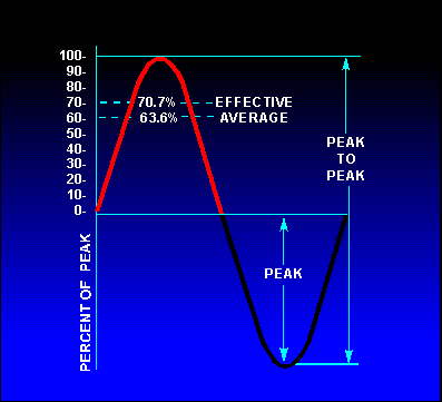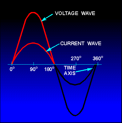 BASIC AC GENERATION - When a conductor is in a magnetic field and either the field or the conductor moves, an emf (voltage) is induced in the conductor. This effect is called electromagnetic induction. A loop of wire rotating in a magnetic field produces a voltage which constantly changes in amplitude and direction. The waveform produced is called a sine wave and is a graphical picture of alternating current (ac). One complete revolution (360) of the conductor produces one cycle of ac. The cycle is composed of two alternations: a positive alternation and a negative alternation. One cycle of ac in one second is equal to 1 hertz (1 Hz). FREQUENCY - The number of cycles of ac per second is referred to as the FREQUENCY. AC frequency is measured in hertz. Most ac equipment is rated by frequency as well as by voltage and current. PERIOD - The time required to complete one cycle of a waveform is called the PERIOD OF THE WAVE. Each ac sine wave is composed of two alternations. The alternation which occurs during the time the sine wave is positive is called the positive alternation. The alternation which occurs during the time the sine wave is negative is called the negative alternation. In each cycle of sine wave, the two alternations are identical in size and shape, but opposite in polarity. The period of a sine wave is inversely proportional to the frequency; e.g., the higher the frequency, the shorter the period. The mathematical relationships between time and frequency are WAVELENGTH - The period of a sine wave is defined as the time it takes to complete one cycle. The distance the waveform covers during this period is referred to as the wavelength. Wavelength is indicated by lambda (λ) and is measured from a point on a given waveform (sine wave) to the corresponding point on the next waveform. PEAK AND PEAK-TO-PEAK VALUES - The maximum value reached during one alternation of a sine wave is the peak value. The maximum reached during the positive alternation to the maximum value reached during the negative alternation is the peak-to-peak value. The peak-to-peak value is twice the peak value. INSTANTANEOUS VALUE - The instantaneous value of a sine wave of alternating voltage or current is the value of voltage or current at one particular instant of time. There are an infinite number of instantaneous values between zero and the peak value. AVERAGE VALUE - The average value of a sine wave of voltage or current is the average of all the instantaneous values during one alternation. The average value is equal to 0.636 of the peak value. The formulas for average voltage and average current are: Remember: The average value (Eavg or I avg) is for one alternation only. The average value of a complete sine wave is zero. EFFECTIVE VALUE - The effective value of an alternating current or voltage is the value of alternating current or voltage that produces the same amount of heat in a resistive component that would be produced in the same component by a direct current or voltage of the same value. The effective value of a sine wave is equal to 0.707 times the peak value. The effective value is also called the root mean square or rms value. The term rms value is used to describe the process of determining the effective value of a sine wave by using the instantaneous value of voltage or current. You can find the rms value of a current or voltage by taking equally spaced instantaneous values on the sine wave and extracting the square root of the average of the sum of the instantaneous values. This is where the term "Root-Mean-Square" (rms) value comes from. The formulas for effective and maximum values of voltage and current are: SINE WAVES IN PHASE - When two sine waves are exactly in step with each other, they are said to be in phase. To be in phase, both sine waves must go through their minimum and maximum points at the same time and in the same direction. SINE WAVES OUT OF PHASE - When two sine waves go through their minimum and maximum points at different times, a phase difference exists between them. The two waves are said to be out of phase with each other. To describe this phase difference, the terms lead and lag are used. The wave that reaches its minimum (or maximum) value first is said to lead the other wave. The term lag is used to describe the wave that reaches its minimum (or maximum) value some time after the first wave does. When a sine wave is described as leading or lagging, the difference in degrees is usually stated. For example, wave E1 leads wave E 2 by 90, or wave E2 lags wave E 1 by 90. Remember: Two sine waves can differ by any number of degrees except 0 and 360. Two sine waves that differ by 0 or by 360 are considered to be in phase. Two sine waves that are opposite in polarity and that differ by 180 are said to be out of phase, even though they go through their minimum and maximum points at the same time. OHM'S LAW IN AC CIRCUIT - All dc rules and laws apply to an ac circuit that contains only resistance. The important point to remember is: Do not mix ac values. Ohm's Law formulas for ac circuits are given below: |