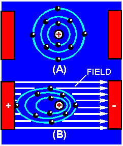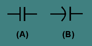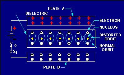 Figure 3-3. - Distortion of electron orbital paths due to electrostatic force. Q.2 State four characteristics of electrostatic lines of force. THE SIMPLE CAPACITOR A simple capacitor consists of two metal plates separated by an insulating material called a dielectric, as illustrated in figure 3-4. Note that one plate is connected to the positive terminal of a battery; the other plate is connected through a closed switch (S1) to the negative terminal of the battery. Remember, an insulator is a material whose electrons cannot easily escape their orbits. Due to the battery voltage, plate A is charged positively and plate B is charged negatively. (How this happens is explained later in this chapter.) Thus an electrostatic field is set up between the positive and negative plates. The electrons on the negative plate (plate B) are attracted to the positive charges on the positive plate (plate A). Figure 3-4. - Distortion of electron orbits in a dielectric. Notice that the orbits of the electrons in the dielectric material are distorted by the electrostatic field. The distortion occurs because the electrons in the dielectric are attracted to the top plate while being repelled from the bottom plate. When switch S1 is opened, the battery is removed from the circuit and the charge is retained by the capacitor. This occurs because the dielectric material is an insulator, and the electrons in the bottom plate (negative charge) have no path to reach the top plate (positive charge). The distorted orbits of the atoms of the dielectric plus the electrostatic force of attraction between the two plates hold the positive and negative charges in their original position. Thus, the energy which came from the battery is now stored in the electrostatic field of the capacitor. Two slightly different symbols for representing a capacitor are shown in figure 3-5.Notice that each symbol is composed of two plates separated by a space that represents the dielectric. The curved plate in (B) of the figure indicates the plate should be connected to a negative polarity. Figure 3-5. - Circuit symbols for capacitors. Q.4 What are the basic parts of a capacitor? |