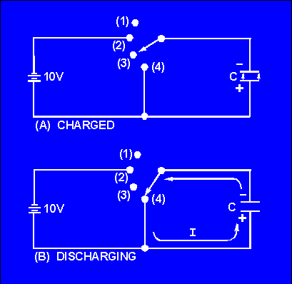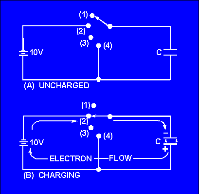 CHARGING In order to better understand the action of a capacitor in conjunction with other components, the charge and discharge actions of a purely capacitive circuit are analyzed first. For ease of explanation the capacitor and voltage source shown in figure 3-6 are assumed to be perfect (no internal resistance), although this is impossible in practice. In figure 3-6(A), an uncharged capacitor is shown connected to a four-position switch. With the switch in position 1 the circuit is open and no voltage is applied to the capacitor. Initially each plate of the capacitor is a neutral body and until a difference of potential is impressed across the capacitor, no electrostatic field can exist between the plates. Figure 3-6. - Charging a capacitor. To CHARGE the capacitor, the switch must be thrown to position 2, which places the capacitor across the terminals of the battery. Under the assumed perfect conditions, the capacitor would reach full charge instantaneously. However, the charging action is spread out over a period of time in the following discussion so that a step-by-step analysis can be made. At the instant the switch is thrown to position 2 (fig. 3-6(B)), a displacement of electrons occurs simultaneously in all parts of the circuit. This electron displacement is directed away from the negative terminal and toward the positive terminal of the source (the battery). A brief surge of current will flow as the capacitor charges. If it were possible to analyze the motion of the individual electrons in this surge of charging current, the following action would be observed. See figure 3-7. Figure 3-7. - Electron motion during charge. At the instant the switch is closed, the positive terminal of the battery extracts an electron from the bottom conductor. The negative terminal of the battery forces an electron into the top conductor. At this same instant an electron is forced into the top plate of the capacitor and another is pulled from the bottom plate. Thus, in every part of the circuit a clockwise DISPLACEMENT of electrons occurs simultaneously. As electrons accumulate on the top plate of the capacitor and others depart from the bottom plate, a difference of potential develops across the capacitor. Each electron forced onto the top plate makes that plate more negative, while each electron removed from the bottom causes the bottom plate to become more positive. Notice that the polarity of the voltage which builds up across the capacitor is such as to oppose the source voltage. The source voltage (emf) forces current around the circuit of figure 3-7 in a clockwise direction. The emf developed across the capacitor, however, has a tendency to force the current in a counterclockwise direction, opposing the source emf. As the capacitor continues to charge, the voltage across the capacitor rises until it is equal to the source voltage. Once the capacitor voltage equals the source voltage, the two voltages balance one another and current ceases to flow in the circuit. In studying the charging process of a capacitor, you must be aware that NO current flows THROUGH the capacitor. The material between the plates of the capacitor must be an insulator. However, to an observer stationed at the source or along one of the circuit conductors, the action has all the appearances of a true flow of current, even though the insulating material between the plates of the capacitor prevents the current from having a complete path. The current which appears to flow through a capacitor is called DISPLACEMENT CURRENT. When a capacitor is fully charged and the source voltage is equaled by the counter electromotive force (cemf) across the capacitor, the electrostatic field between the plates of the capacitor is maximum. (Look again at figure 3-4.) Since the electrostatic field is maximum the energy stored in the dielectric is also maximum. If the switch is now opened as shown in figure 3-8(A),the electrons on the upper plate are isolated. The electrons on the top plate are attracted to the charged bottom plate. Because the dielectric is an insulator, the electrons can not cross the dielectric to the bottom plate. The charges on both plates will be effectively trapped by the electrostatic field and the capacitor will remain charged indefinitely. You should note at this point that the insulating dielectric material in a practical capacitor is not perfect and small leakage current will flow through the dielectric. This current will eventually dissipate the charge. However, a high quality capacitor may hold its charge for a month or more. Figure 3-8. - Discharging a capacitor. To review briefly, when a capacitor is connected across a voltage source, a surge of charging current flows. This charging current develops a cemf across the capacitor which opposes the applied voltage. When the capacitor is fully charged, the cemf is equal to the applied voltage and charging current ceases. At full charge, the electrostatic field between the plates is at maximum intensity and the energy stored in the dielectric is maximum. If the charged capacitor is disconnected from the source, the charge will be retained for some period of time. The length of time the charge is retained depends on the amount of leakage current present. Since electrical energy is stored in the capacitor, a charged capacitor can act as a source emf. DISCHARGING To DISCHARGE a capacitor, the charges on the two plates must be neutralized. This is accomplished by providing a conducting path between the two plates as shown in figure 3-8(B). With the switch in position (4) the excess electrons on the negative plate can flow to the positive plate and neutralize its charge. When the capacitor is discharged, the distorted orbits of the electrons in the dielectric return to their normal positions and the stored energy is returned to the circuit. It is important for you to note that a capacitor does not consume power. The energy the capacitor draws from the source is recove