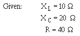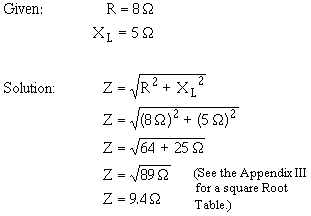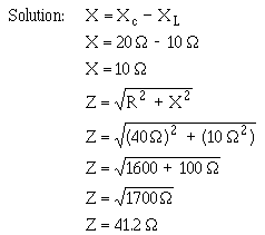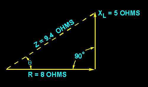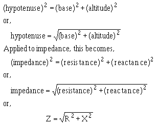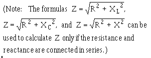 From your study of inductance and capacitance you know how inductive reactance and capacitive reactance act to oppose the flow of current in an ac circuit. However, there is another factor, the resistance, which also opposes the flow of the current. Since in practice ac circuits containing reactance also contain resistance, the two combine to oppose the flow of current. This combined opposition by the resistance and the reactance is called the IMPEDANCE, and is represented by the symbol Z. Since the values of resistance and reactance are both given in ohms, it might at first seem possible to determine the value of the impedance by simply adding them together. It cannot be done so easily, however. You know that in an ac circuit which contains only resistance, the current and the voltage will be in step (that is, in phase), and will reach their maximum values at the same instant. You also know that in an ac circuit containing only reactance the current will either lead or lag the voltage by one-quarter of a cycle or 90 degrees. Therefore, the voltage in a purely reactive circuit will differ in phase by 90 degrees from that in a purely resistive circuit and for this reason reactance and resistance are rot combined by simply adding them. When reactance and resistance are combined, the value of the impedance will be greater than either. It is also true that the current will not be in step with the voltage nor will it differ in phase by exactly 90 degrees from the voltage, but it will be somewhere between the in-step and the 90-degree out-of-step conditions. The larger the reactance compared with the resistance, the more nearly the phase difference will approach 90. The larger the resistance compared to the reactance, the more nearly the phase difference will approach zero degrees. If the value of resistance and reactance cannot simply be added together to find the impedance, or Z, how is it determined? Because the current through a resistor is in step with the voltage across it and the current in a reactance differs by 90 degrees from the voltage across it, the two are at right angles to each other. They can therefore be combined by means of the same method used in the construction of a right-angle triangle. Assume you want to find the impedance of a series combination of 8 ohms resistance and 5 ohms inductive reactance. Start by drawing a horizontal line, R, representing 8 ohms resistance, as the base of the triangle. Then, since the effect of the reactance is always at right angles, or 90 degrees, to that of the resistance, draw the line XL, representing 5 ohms inductive reactance, as the altitude of the triangle. This is shown in figure 4-5. Now, complete the hypotenuse (longest side) of the triangle. Then, the hypotenuse represents the impedance of the circuit. Figure 4-5. - Vector diagram showing relationship of resistance, inductive reactance, and impedance in a series circuit. One of the properties of a right triangle is: Now suppose you apply this equation to check your results in the example given above. When you have a capacitive reactance to deal with instead of inductive reactance as in the previous example, it is customary to draw the line representing the capacitive reactance in a downward direction. This is shown in figure 4-6. The line is drawn downward for capacitive reactance to indicate that it acts in a direction opposite to inductive reactance which is drawn upward. In a series circuit containing capacitive reactance the equation for finding the impedance becomes: Figure 4-6. - Vector diagram showing relationship of resistance, capacitive reactance, and impedance in a series circuit. In many series circuits you will find resistance combined with both inductive reactance and capacitive reactance. Since you know that the value of the reactance, X, is equal to the difference between the values of the inductive reactance, XL, and the capacitive reactance, XC, the equation for the impedance in a series circuit containing R, XL, and XC then becomes: In figure 4-7 you will see the method which may be used to determine the impedance in a series circuit consisting of resistance, inductance, and capacitance. Figure 4-7. - Vector diagram showing relationship of resistance, reactance (capacitive and inductive), and impedance in a series circuit. Assume that 10 ohms inductive reactance and 20 ohms capacitive reactance are connected in series with 40 ohms resistance. Let the horizontal line represent the resistance R. The line drawn upward from the end of R, represents the inductive reactance, XL. Represent the capacitive reactance by a line drawn downward at right angles from the same end of R. The resultant of XL and XC is found by subtracting XL from XC. This resultant represents the value of X. Thus: The line, Z, will then represent the resultant of R and X. The value of Z can be calculated as follows: Q.15 What term is given to total opposition to ac in a circuit? |