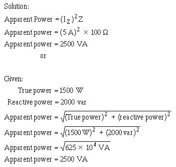 Apparent power is the power that appears to the source because of the circuit impedance. Since the impedance is the total opposition to ac, the apparent power is that power the voltage source "sees." Apparent power is the combination of true power and reactive power. Apparent power is not found by simply adding true power and reactive power just as impedance is not found by adding resistance and reactance. To calculate apparent power, you may use either of the following formulas: For example, find the apparent power for the circuit shown in figure 4-10. Recall that current in a series circuit is the same in all parts of the circuit. Q.25 What is apparent power? |