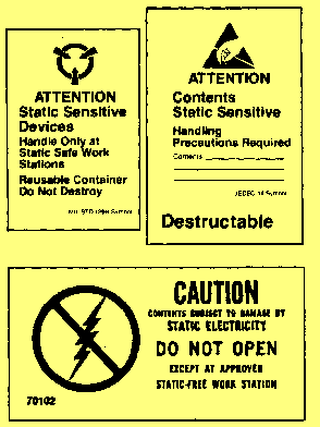 NOTE: The POLARITY switch should remain OFF while the transistor is connected to or disconnected from the test set. If you determine that the beta reading is less than 10, reset the RANGE switch to X1 and reset the meter to zero. After connecting the yellow test lead to the emitter, the green test lead to the base, and the blue test lead to the collector, plug the test probe (not shown) into the jack located at the lower right-hand corner of the test set. When testing grounded equipment, unplug the 115 vac line cord and use battery operation. The beta reading is attained by multiplying the meter reading times the RANGE switch setting. Refer to the transistor characteristics book provided with the tester to determine if the reading is normal for the type of transistor under test. ELECTRODE RESISTANCE MEASUREMENTS. - Connect the in-circuit probe test leads to the transistor with the yellow lead to the emitter, the green lead to the base, and the blue lead to the collector. Set the FUNCTION switch to the OHMS E-B position, and read the resistance between the emitter and base electrode on the center scale of the meter. To read the resistance between the collector and base and the collector and emitter, set the FUNCTION switch to OHMS C-B and OHMS C-E. These in-circuit electrode resistance measurements are used to correctly interpret the in-circuit beta measurements. The accuracy of the BETA X1, X10 range is 15 percent only when the emitter-to-base load is equal to or greater than 300 ohms. Ico MEASUREMENTS. - Adjust the METER ZERO control for zero meter indication. Plug the transistor to be tested into the jack or connect test leads to the device under test. Set the PNP/NPN switch to correspond with the transistor under test. Set the FUNCTION switch to Ico and the RANGE switch to X0.1, X1, or X10 as specified by the transistor data book for allowable leakage. Read the amount of leakage on the bottom scale, and multiply this by the range setting figure as required. DIODE MEASUREMENTS. - Diode qualitative in-circuit measurements are attained by connecting the green test lead to the cathode and the yellow test lead to the anode. Set the FUNCTION switch to DIODE IN/CKT and the RANGE switch to X1. (Ensure that the meter has been properly zeroed on this scale.) If the meter reads down scale, reverse the POLARITY switch. If the meter reads less than midscale, the diode under test is either open or shorted. The related circuit impedance of this test is less than 25 ohms. PRECAUTIONS. - Transistors, although generally more rugged mechanically than electron tubes, are susceptible to damage by excessive heat and electrical overload. The following precautions should be taken in servicing transistorized equipment: Test equipment and soldering irons must be checked to make certain that there is no leakage current from the power source. If leakage current is detected, isolation transformers must be used. Ohmmeter ranges that require a current of more than 1 milliampere in the test circuit are not to be used for testing transistors. Battery eliminators should not be used to furnish power for transistor equipment because they have poor voltage regulation and, possibly, high ripple voltage. The heat applied to a transistor, when soldered connections are required, should be kept to a minimum by using a low-wattage soldering iron and heat shunts (such as long-nose pliers) on the transistor leads. All circuits should be checked for defects before a transistor is replaced. The power should be removed from the equipment before replacing a transistor or other circuit part. When working on equipment with closely spaced parts, you will find that conventional test probes are often the cause of accidental short circuits between adjacent terminals. Momentary short circuits, which rarely cause damage to an electron tube, may ruin a transistor. To avoid accidental shorts, a test probe can be covered with insulation for all but a very short length of the tip. Electrostatic Discharge Sensitive (ESDS) Care Devices that are sensitive to electrostatic discharge (ESD) require special handling. You can readily identify ESD-sensitive (ESDS) devices by the symbols shown in figure 2-5. Static electricity is created whenever two substances (solid or fluid) are rubbed together or separated. The rubbing or separating of substances causes the transfer of electrons from one substance to the other; one substance then becomes positively charged, and the other becomes negatively charged. When either of these charged substances comes in contact with a grounded conductor, an electrical current flows until that substance is at the same electrical potential as ground. Figure 2-5. - Warning symbols for ESDS devices.