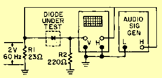 Diodes, such as general-purpose germanium and silicon diodes, power silicon diodes, and microwave silicon diodes, are most effectively tested under actual operating conditions. However, rectifier testers are available for you to determine direct-current characteristics that provide an indication of diode quality. Rf Diode Test A common type of diode test set is a combination ohmmeter-ammeter. You can make measurements of forward resistance, back resistance, and reverse current with this equipment. You can determine the condition of the rectifier under test by comparing its actual values with typical values obtained from test information furnished with the test set or from the manufacturer's data sheets. Comparing the diode's back and forward resistance at a specified voltage provides you with a rough indication of the rectifying property of a diode. A typical back-to-forward resistance ratio is on the order of 10 to 1, and a forward-resistance value of 50 to 80 ohms is common. Switching Diode Test To effectively test diodes used for computer applications, you must obtain back-resistance measurements at a large number of different voltage levels. This can be done efficiently by using a dynamic diode tester in conjunction with an oscilloscope, which is used to display the diode's back-current-versus-voltage curve. You can easily interpret diode characteristics, such as flutter, hysteresis, and negative resistance, through use of the dynamic current and voltage display. DIODE CHARACTERISTIC GRAPHICAL DISPLAY You can use an oscilloscope to graphically display the forward- and back-resistance characteristics of a diode. A test circuit used in conjunction with an oscilloscope is shown in figure 2-7. This circuit uses an audio-signal generator as the test signal. It should be adjusted for an approximate 2-volt, 60-hertz signal, as measured across R1. Figure 2-7. - Display circuit used with an oscilloscope.