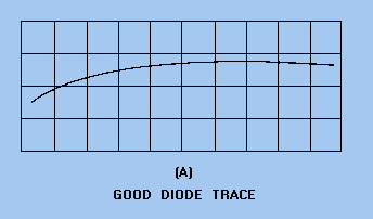 Reverse Voltage-Current Analysis You can make an analysis of the reverse voltage-current portion of the characteristic curve for a diode with the method described above or with a diode test set. This test is very important for diodes used in computer applications, where stability of operation is essential. Various diode conditions that may be detected by this test are shown in figure 2-9, view A, view B, view C, and view D. Figure 2-9A. - Diode reverse current-voltage characteristics. GOOD DIODE TRACE