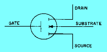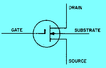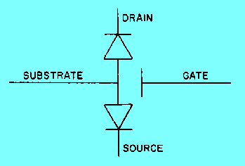 N-Channel Test Using an ohmmeter set to the R X 100 scale, measure the resistance between the drain and the source; then reverse the ohmmeter leads and take another reading. Both readings should be equal (in the 100- to 10,000-ohm range), regardless of the meter lead polarity. Connect the positive meter lead to the gate. Using the negative lead, measure the resistance between the gate and the drain; then measure the resistance between the gate and the source. Both readings should indicate a low resistance and be approximately the same. Disconnect the positive lead from the gate and connect the negative lead to the gate. Using the positive lead, measure the resistance between the gate to the drain; then measure the resistance between the gate and the source. Both readings should show infinity. P-Channel Test Using an ohmmeter set to the R X 100 scale, measure the resistance between the drain and the source; then reverse the ohmmeter leads and take another reading. Both readings should be the same (100 to 10,000 ohms), regardless of meter lead polarity. Next, connect the positive meter lead to the gate. Using the negative lead, measure the resistance between the gate and the drain; then measure it between the gate and the source. Both readings should show infinity. Disconnect the positive lead from the gate and connect the negative lead to the gate. Using the positive lead, measure the resistance between the gate and the drain; then measure it between the gate and the source. Both readings should indicate a low resistance and be approximately equal. Another type of semiconductor you should become familiar with is the metal oxide semiconductor field-effect transistor (MOSFET), as shown in figures 2-19 and 2-20. You must be extremely careful when working with MOSFETs because of their high degree of sensitivity to static voltages. As previously mentioned in this chapter, the soldering iron should be grounded. A metal plate should be placed on the workbench and grounded to the ship's hull through a 250-kilohm to 1-megohm resistor. You should also wear a bracelet with an attached ground strap and ground yourself to the ship's hull through a 250-kilohm to 1-megohm resistor. You should not allow a MOSFET to come into contact with your clothing, plastics, or cellophane-type materials. A vacuum plunger (solder sucker) must not be used because of the high electrostatic charges it can generate. Solder removal by wicking is recommended. It is also good practice to wrap MOSFETs in metal foil when they are out of a circuit. To ensure MOSFET safety under test, use a portable volt-ohm-milliammeter (vom) to make MOSFET resistance measurements. A vtvm must never be used in testing MOSFETs. You must be aware that while you are testing a MOSFET, you are grounded to the ship's hull or station's ground. Use of a vtvm would cause a definite safety hazard because of the 115-volt, 60-hertz power input. When the resistance measurements are complete and the MOSFET is properly stored, unground both the plate on the workbench and yourself. You will understand MOSFET testing better if you visualize it as equivalent to a circuit using diodes and resistors, as shown in figures 2-21 and 2-22. Figure 2-19. - MOSFET (depletion/enhancement type).