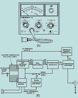 Bolometer Power Meter The standard power meter used in the Navy (Hewlett-Packard 431 C) is an automatic self-balancing instrument employing dual-bridge circuits. It is designed to operate with temperature-compensated thermistor mounts that enable you to measure power in a 50-ohm coaxial system from 10 MHz to 18 GHz and in a waveguide system from 2.6 GHz to 40 GHz. This power meter can be operated from either an ac or a dc primary power source. The ac source can be either 115 or 230 volts at 50 to 400 hertz. The dc source is a 24-volt rechargeable battery. A seven-position range switch allows full-scale power measurements of 10 microwatts to 10 milliwatts or of -20 dBm to +10 dBm. These ranges can be further extended with the aid of attenuators. The thermistor mount (as shown in fig. 3-17) contains two thermistors: one in the detection bridge, which absorbs the microwave power to be measured, and the other in the compensation and metering bridge, which supplies temperature compensation and converts the measured rf power to a meter indication. Each bridge includes its respective thermistor element as a bridge arm. Figure 3-17. - Power meter.