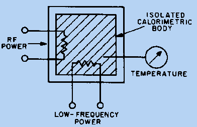 Basically, the power meter circuit consists of two bridges; each bridge includes one of the thermistor elements as a bridge arm. The bridges are made self-balancing through the use of feedback loops. Positive or regenerative feedback is used in feedback loop 1; degenerative (negative) feedback is used in feedback loop 2. Both bridges are excited by a common 10-kHz source. The 10-kHz amplifier-oscillator supplies 10-kHz power to bias the thermistor in feedback loop 1 to produce the resistance required to balance the rf bridge. An equal amount of 10-kHz power is supplied by the same oscillator to the second thermistor in feedback loop 2 through two series-connected transformers. Feedback loop 2 balances the meter bridge. When rf is applied to the thermistor in the detection bridge (but not to the compensation and metering bridge), an amount of 10-kHz power is present, equal to the rf power being removed from the detection bridge by the self-balancing action of the bridge. Since the rf power replaced the 10-kHz power, the detection bridge is in balance; however, the metering bridge must be balanced by its separate feedback loop. Sufficient dc power to equal the 10-kHz power lost by the metering bridge is automatically replaced, balancing this loop. Hence the dc power applied to the metering bridge thermistor is equal to the microwave power applied to the detection bridge. The meter circuit senses the magnitude of the feedback current. The resultant meter current passes through a differential amplifier to the indicating meter. The two thermistors are matched with respect to their temperature characteristics; therefore, there is only a very small amount of drift of the zero point with ambient temperature changes. When there is a change in temperature, there is a change in the electrical power needed by the thermistors to maintain constant operating resistances. This change is automatically performed by feedback loop 1, which changes the amount of 10-kHz power for both thermistors by the proper amount. The dc power in feedback loop 2 is not changed; and since it is this dc power that is metered, the temperature change has not affected the meter indication. The calorimeters are the most accurate of all instruments for measuring high power. Calorimeters depend on the complete conversion of the input electromagnetic energy into heat. Direct heating requires the measurement of the heating effect on the medium, or load, terminating the line. Indirect heating requires the measurement of the heating effect on a medium or body other than the original power-absorbing material. Power measurement with true calorimeter methods is based solely on temperature, mass, and time. Substitution methods use a known, low-frequency power to produce the same physical effect as an unknown rf power being measured. Calorimeters are classified as STATIC (nonflow) types and CIRCULATING (flow) types. Q.15 Power measurements performed with calorimeters are based on what three variables? Static Calorimeters The static calorimeter uses a thermally shielded body. Since an isolated body loses little heat to a surrounding medium, the temperature increase of the body is in direct proportion to the time of applied power. The product of the rate of temperature rise in the calorimetric body and its heat capacity equals applied power. Figure 3-18 illustrates a static-type calorimeter. Figure 3-18. - Static calorimeter using low-frequency power substitution.