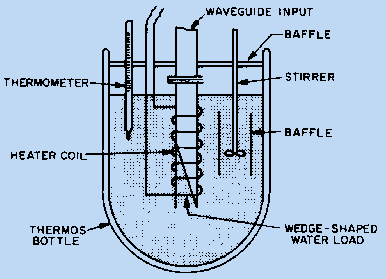The most common type of static calorimeter is the ADIABATIC calorimeter. In the adiabatic meter, power is applied directly to a thermally isolated body; and the rate of temperature rise is determined from a temperature change measurement during a sufficiently long, known time interval. Figure 3-19 illustrates an adiabatic calorimeter using water as the body contained in a covered Dewar flask. A tapered-wall, open-ended waveguide contains a sealed, inclined glass partition to create a wedge-shaped water load of low-reflection coefficient. Thorough mixing of the water is accomplished with a stirrer, and a sensitive thermometer measures the temperature rise. A heating coil is wound around the waveguide inside the calorimeter and is used for calibrating purposes when low-frequency power is applied. This type of meter can be used for accurate measurement of several hundred watts of average power and can withstand 50 kilowatts of peak power. Figure 3-19. - Adiabatic calorimeter.