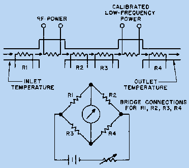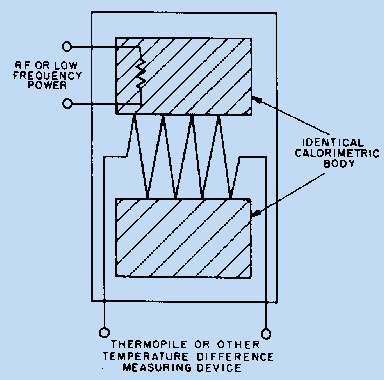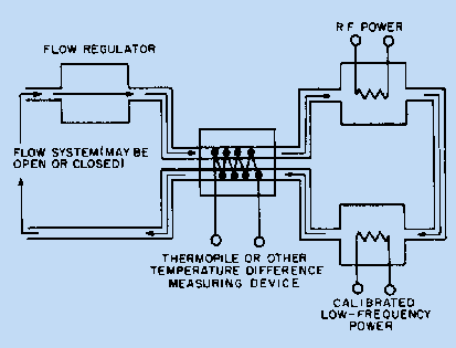 Flow Calorimeters Flow calorimeters are classified by the type of circulating method used (open or closed), the type of heating used (direct or indirect), and the type of measurement performed (true calorimetric or substitution). Water or other calorimetric fluid is used only once in an open system. An overflow system is used to maintain a constant rate of flow. Closed systems recirculate the fluid continuously by means of a pump, and a cooling system restores the fluid to ambient temperatures prior to its return to the calorimeter. Closed systems are more elaborate and permit the use of fluids other than water. Flow calorimeters provide the primary standards for the measurement of high power levels; and, in conjunction with calibrated directional couplers, attenuators, power dividers, or other similar devices serve to standardize medium- and low-power measuring instruments. The measurement time depends on the required time for the entering fluid to reach the outlet, where the rise in temperature is measured. The circulating fluid may serve in a dual capacity as the dissipative medium and coolant, using the direct heating method, or solely as a coolant, using the indirect heating method. Because of its excellent thermal properties and high dielectric losses at 1 GHz or higher, water is normally used in both heating methods. Water is rarely used as the fluid at frequencies lower than 100 MHz, because of insufficient dielectric losses. The indirect heating method offers a wider frequency and power-range coverage and can be used in substitution-type measurements. True calorimetric measurements contain appreciable error, because of nonuniformity of flow rate, air bubbles, flow-rate measurement inaccuracies, and temperature rise. Flow regulators, bubble traps, and good thermal insulation are required to eliminate the majority of these errors. Substitution methods do not involve direct heat dissipation measurement of moving fluid. Greater accuracy is obtained because known low-frequency power is substituted for the unknown rf power, with all other measurement parameters remaining constant. The accuracy depends on the exactness of the low-frequency power determination and the degree to which factors remain fixed during the substitution of one type of power with another. Figure 3-22 illustrates a flow calorimeter using low-frequency power substitution. Two different measurement techniques are possible with this type of meter: the calibration technique and the balance technique. The CALIBRATION TECHNIQUE uses an adjustable known power to exactly reproduce the same temperature indication originally obtained by the unknown rf power measurement. The BALANCE TECHNIQUE uses an initial low-frequency power (P1) to provide a steady-state temperature rise in the calorimetric fluid. When unknown rf power is applied, the original power (P1) is reduced to a new power (P2) to maintain the same temperature indication. Therefore, the actual power equals P1 minus P2. Figure 3-23 illustrates a widely used method of power measurement using a balanced-flow calorimeter. Temperature-sensitive resistors are bridge-connected as the thermometric elements and are balanced at ambient temperature prior to the application of power. Low-frequency balancing power and the unknown rf power are applied to maintain the bridge at null. This occurs when the temperature rise caused by the unknown rf power equals the temperature rise caused by the known low-frequency power. Figure 3-22. - Flow calorimetric system using substitution at low-frequency power.