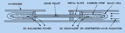 The NONADIABATIC calorimeter uses an rf termination with a resistive film strip or LOSSY dielectric materials (solids or liquids that are designed to efficiently dissipate the applied power) as a load. Temperature indication can be accomplished with thermocouples, thermopiles, thermistors, thermometers, bimetallic strips, and manometers. Calibration is against a power standard or known low-frequency power. Based on the above principle, a coaxial calorimeter of good sensitivity with a short, 50-ohm resistive film on a lava (dielectric) center conductor, enclosed within a tapered, thin-walled outer conductor, is used for frequencies between 0 and 1.2 GHz. The rf termination is electrically connected to, but thermally isolated from, a massive mounting plate by a short section of silvered-lava coaxial line with a high thermal resistance. The steady-state temperature rise of the outer casing of the load with respect to the mounting plate is measured by a differential platinum-resistance thermometer in a Wheatstone bridge. Low-frequency power applied to the termination provides a method of calibration. Power in the range of 0 to 2.5 watts may be measured. A 70-second time constant and steady-state temperatures are attained in about 6 minutes. The small physical size of termination (to keep convective and radiative heat losses low) provides high sensitivity. Calibration with lower frequency power is extremely accurate, because the termination is broadband and should exhibit the same power distribution from dc to 10 gigahertz. A twin calorimeter provides a method of using two calorimetric bodies thermally shielded against ambient temperature variations and improves sensitivity. Figure 3-20 illustrates this type of calorimetric device. The power to be measured is applied to one calorimetric body; the other calorimetric body acts as a temperature reference. The steady-state temperature difference between the two calorimeters is used as a measure of rf power. Calibration is performed by applying low-frequency power. A differential-air, thermometer-type temperature difference indicator, shown in figure 3-21, is used with a twin calorimeter to measure microwave power in the 0.1-mW range. This instrument consists of two similar glass cells connected by a capillary tube containing a liquid pellet. Each glass cell contains a tapered, carbon-coated strip; and the entire assembly is mounted in a rectangular waveguide. Balancing dc power heats one strip; the other strip is heated by rf power. The liquid pellet, which indicates the differential expansion of the air within the two cells, is viewed through an aperture in the waveguide wall, preferably with a microscopy for highest sensitivity. This procedure permits a 2% accuracy at 10 mW. Figure 3-20. - Twin calorimetric system.