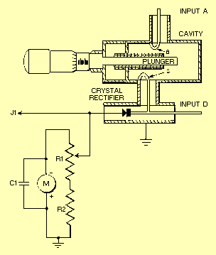 The wavemeter illustrated is of the type commonly used for the measurement of microwave frequencies. The device employs a resonant cavity, which effectively acts as a high-Q LC tank circuit. The resonant frequency of the cavity is varied by means of a plunger that is mechanically connected to a micrometer mechanism. Movement of the plunger into the cavity reduces the cavity size and increases the resonant frequency. Conversely, an increase in the size of the cavity (made by withdrawing the plunger) lowers the resonant frequency. The microwave energy from the equipment under test is fed into the wavemeter through one of two inputs, A or D. A crystal rectifier then detects or rectifies the signal, and the rectified current is indicated on the current meter, M. The instrument can be used as either a transmission type or an absorption type of wavemeter. When used as a transmission wavemeter, the unknown signal is coupled into the circuit by means of input A. When the cavity is tuned to the resonant frequency of the signal, energy is coupled through coupling loop B into the cavity and out through loop C to the crystal rectifier where it is rectified and indicated on the meter. At frequencies off resonance little or no current flows in the detector and the meter reading is small. Therefore, the micrometer and attached plunger are varied until a maximum meter reading is obtained. The micrometer setting is then compared with a calibration chart supplied with the wavemeter to determine the unknown frequency. When the unknown signal is relatively weak, such as the signal from a klystron oscillator, the wavemeter is usually used as an absorption type of device. Connection is made to the instrument at input D. Rf loop C then acts as an injection loop to the cavity. When the cavity is tuned to the resonant frequency of the klystron, maximum energy is absorbed by the cavity, and the current indicated on the meter dips. When the cavity is not tuned to the frequency of the klystron, high current is indicated on the current meter. Therefore, the cavity is tuned for a minimum reading, or dip, in the meter; and the resonant frequency is determined from the micrometer setting and the calibration chart. The potentiometer, R1, is used to adjust the sensitivity of the meter from the front panel of the instrument. J1 is a video jack and is provided for observing video waveforms with a test oscilloscope. |