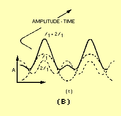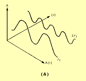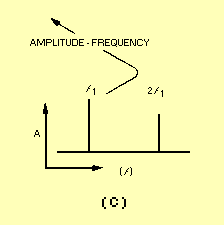 SPECTRUM WAVEFORM ANALYSIS AND MEASUREMENTS An analysis of a complex waveform, prepared in terms of a graphic plot of the amplitude versus frequency, is known as SPECTRUM ANALYSIS. Spectrum analysis recognizes the fact that waveforms are composed of the summation of a group of sinusoidal waves, each of an exact frequency and all existing together simultaneously. Three axes of degree (amplitude, time, and frequency) are important when considering varying frequency. The time-domain (amplitude versus time) plot is used to consider phase relationships and basic timing of the signal and is normally observed with an oscilloscope. The frequency-domain (amplitude versus frequency) plot is used to observe Frequency response - the spectrum analyzer is used for this purpose. Figure 5-8 illustrates the differences between frequency- and time-domain plots. View A illustrates a three-dimensional coordinate of a fundamental frequency (f1) and its second harmonic (2f1) with respect to time, frequency, and amplitude. View B shows the time-domain display as it would be seen on an oscilloscope. The solid line, f1 + 2f1 is the actual display. The dashed lines, f and 2f1 are drawn to illustrate the fundamental and second harmonic frequency relationship used to formulate the composite signal f1 + 2f1. View C is the frequency-domain display as it would be seen on a spectrum analyzer. Note in view C that the components of the composite signal are clearly seen. Q.4 A spectrum analyzer is designed to display what signal characteristic? Figure 5-8A. - Time versus frequencies.