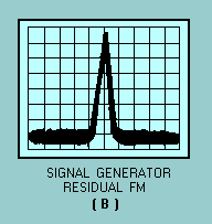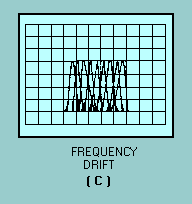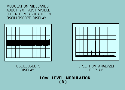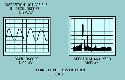FREQUENCY-DOMAIN DISPLAY CAPABILITIES The frequency domain contains information not found in the time domain. The spectrum analyzer can display signals composed of more than one frequency (complex signals). It can also discriminate between the components of the signal and measure the power level at each one. It is more sensitive to low-level distortion than an oscilloscope. Its sensitivity and wide, dynamic range are also useful for measuring low-level modulation, as illustrated in views A and B of figure 5-9. The spectrum analyzer is useful in the measurement of long- and short-term stability such as noise sidebands of an oscillator, residual fm of a signal generator, or frequency drift of a device during warm-up, as shown in views A, B, and C of figure 5-10. Figure 5-9A. - Examples of time-domain (left) and frequency-domain (right) low-level signals.
