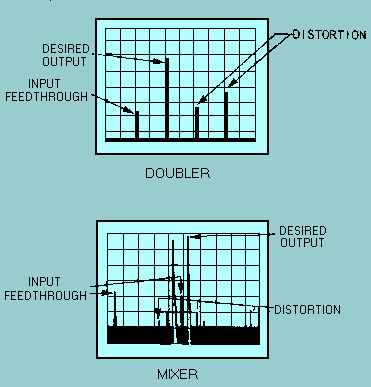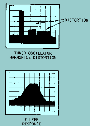 The swept-Frequency response of a filter or amplifier and the swept-distortion measurement of a tuned oscillator are also measurable with the aid of a spectrum analyzer. However, in the course of these measurements, a variable persistence display or an X-Y recorder should be used to simplify readability. Examples of tuned-oscillator harmonics and filter response are illustrated in figure 5-11. Frequency-conversion devices such as mixers and harmonic generators are easily characterized by such parameters as conversion loss, isolation, and distortion. These parameters can be displayed, as shown in figure 5-12, with the aid of a spectrum analyzer. Figure 5-11. - Swept-distortion and response characteristics.