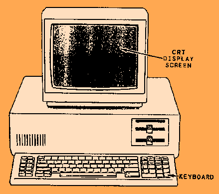 The dot matrix is defined in terms of rows and columns of dots. A 5 by 7 matrix uses up to five vertical columns of seven dots to create a character. An example of a 5 by 7 matrix printing the letter H is shown in figure 2-25, view D. The size of dot matrixes varies from a 5 by 7 matrix to as large as a 58 by 18 matrix. A number of dot-matrix printers use a single vertical column of pins to print characters, as shown in figure 2-25, view B. The characters are printed by moving (stepping) the print head a small amount and printing the vertical columns one at a time until the character is printed as shown in figure 2-25, views C and D. The size of the matrix determines the quality of the printed character. In other words, the more dots used to print a character, the better the character is filled in and the higher its print quality. Dot-matrix printers are faster than the daisy-wheel printers with speeds ranging from 60 to 350 cps, but their print quality is not as good. Ink Jet Printers Ink jet printers employ a technique very similar to the way we use a can of spray paint and a stencil. A spray of electrically charged ink is shot (under pressure) toward the paper. Before reaching the paper, the ink is passed through an electrical field which forms the letters in a matrix form. The print resulting from this process consists of easy to read, high-quality characters. Some manufacturers use large droplets of ink for faster printing, while others use small droplets for better clarity but with slightly reduced printing speeds. These printers can print up to 300 cps. Laser printers direct a beam of light through a rotating disk containing the full range of print characters. The appropriate character image is directed onto photographic paper, which is then put through a toner, developed, and used to make additional copies. The print resulting from this process consists of sharp, clean images that are easy on the eyes. These printers can print up to 20,000 plus lines per minute, or 26,666 cps (characters per second). KEYBOARDS (INPUT) A keyboard is nothing more than an array of switches called keyswitches. Keyboards are designed to input a code to the computer when a keyswitch is depressed. Each keyswitch, or key, on the keyboard is assigned a particular code value; and it is usually imprinted with a legend to identify its function. Figure 2-26 shows a keyboard combined with a crt on a microcomputer. Figure 2-26. - Keyboard combined with a crt and microcomputer.