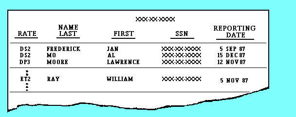 DATA MANAGEMENT Data management software allows you to enter data and then retrieve it in a variety of ways. You define your data fields and set up a display screen with prompts. You enter the data records according to the prompts. Figure 3-9, view A, shows an example. The system writes the records on a disk or tape. Once you have a file keyed and stored, you can retrieve records by a field or several fields or by searching the records for specific data. For example, if you wanted a list of all personnel who reported aboard before January 1988, you could tell the system to search the file and print selected fields of all records that meet that condition. You tell the system what fields to print (that is name, rate, SSN, date reported) and where (what print positions) to print them. At the same time, you can specify in what order you want the records printed. For example, figure 3-9, view B, shows the records printed in alphabetical order by last name. The software also provides routines so you can easily add, delete, and change records. Figure 3-9A. - Data management example. PROMPTS (IN BOLD) AND DATA (IN ITALICS). Figure 3-9B. - Data management example. SAMPLE PRINTED REPORT (SORTED BY LAST NAME). You can also generate reports by specifying what records to use, what fields to print, where to print the fields, and which data fields, if any, need to be combined. For example, your supply officer wants to know the value of the inventory. You can specify that the extended price is to be calculated by multiplying the item quantity by the unit price, and that the extended prices are to be totaled.