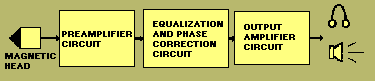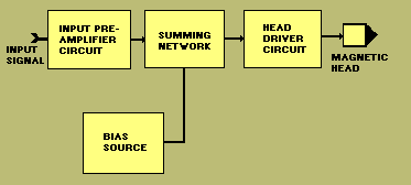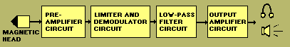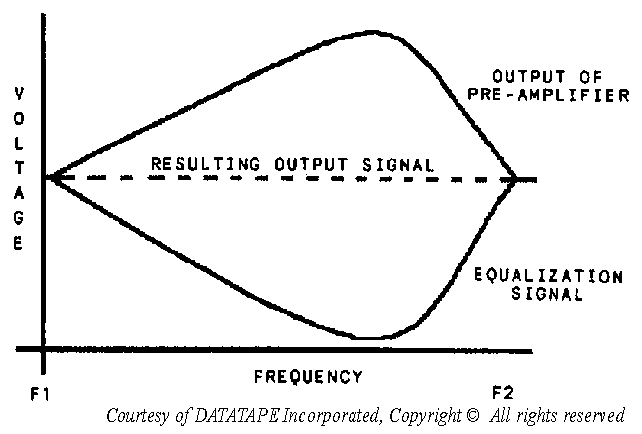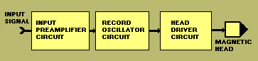 RECORD AND REPRODUCE ELECTRONICS There are two ways to record and reproduce analog signals. The first way is direct record. It's also called amplitude modulation (AM) electronics. The second way is frequency modulation (FM). Even though direct record and reproduce circuits are much different from FM record and reproduce electronics, they both share the same two very important jobs. They both must: Take an input signal, process it as needed, and then send it to the record magnetic head for reproduction. Take the reproduced signal from the reproduce magnetic head, process it as needed, and output it for listening or analysis. DIRECT RECORD ELECTRONICS Direct record electronics record input signals onto magnetic media just as the signals appeared at the recorder's input. The only processing an input signal receives is the adding of a bias signal. The added bias signal makes sure the signal stays away from the steps of the magnetism curve. Figure 5-1 shows a basic block diagram of a recorder's direct record electronics. Figure 5-1. - Direct record electronics. Direct record electronics has four main parts: Input pre-amplifier circuit. This circuit takes the input signal, amplifies it, and sends it to the summing network. It also matches the impedance between the source of the input signal and the magnetic tape recorder. Bias source. This circuit generates the high-frequency bias signal and sends it to the summing network. Normally, the frequency of the bias signal will be five to ten times higher than the highest frequency the tape recorder can record. Summing network. This network takes the input signal and the bias signal, mixes them, and sends the resulting signal to the head driver circuit. Head driver circuit. This circuit takes the signal from the summing network, amplifies it, and sends it to the record head for recording. DIRECT REPRODUCE ELECTRONICS Direct reproduce electronics amplify the very weak input signals from the reproduce head, and send them out for listening or analysis, as needed. Figure 5-2 shows a basic block diagram of direct reproduce electronics. Figure 5-2. - Direct reproduce electronics. Direct reproduce electronics consists of three main parts: Pre-amplifier circuit. This circuit takes the very weak reproduced signal from the reproduce head and (a) amplifies the signal, (b) removes any bias signal that was used during the recording process, and (c) sends the signal to the equalization and phase correction circuit. Equalization and phase correction circuit. This circuit takes the pre-amplified signal and fixes any Frequency response problems that the reproduce magnetic head may have caused. To better understand this, look at the voltage versus Frequency response graph in figure 5-3. The top of the graph shows the input signal that comes from the pre-amplifier and the bottom shows the equalization signal generated by the equalization circuit. In the top part of the graph, note how the output voltage level varies as the frequency of the signal varies. This isn't good. A good output voltage level is one that remains constant as the frequency changes. The equalization signal corrects this problem. Notice that when the input signal and the equalization signal are combined they cancel each other out. This allows a nice flat (voltage versus frequency) output signal to go to the output amplifier circuit. Figure 5-3. - Equalization process. Output amplifier circuit. This circuit takes the signal from the equalization and phase correction circuit and amplifies it for output. It also matches the magnetic recorder's impedance to the output device that is used for listening or recording. FM RECORD ELECTRONICS FM record electronics process signals to be recorded differently than direct record electronics. Instead of recording the input signal just as it appears at the recorder's input, FM record electronics use the input signal to vary (modulate) the carrier frequency of a record oscillator. The frequency modulated output signal of the record oscillator then becomes the signal that's actually recorded onto the magnetic media. Figure 5-4 shows a block diagram of the FM record electronics. Figure 5-4. - FM record electronics. FM record electronics consist of three main parts: Input pre-amplifier circuit. This circuit does two things: (a) it serves as an impedance matcher between the signal source and the magnetic recorder, and (b) it pre-amplifies the input signal. Record oscillator circuit. This circuit generates a carrier signal onto which the input signal will be modulated. The input signal is used to vary (frequency modulate) the carrier signal. This is how the input signal gets frequency modulated onto the carrier signal. The output of this circuit is the frequency-modulated carrier signal. The center frequency of the carrier depends on two things: (a) the bandwidth of the signal you're recording, and (b) the media onto which you're recording. For magnetic tape, the carrier frequency can be as low as 1.688 kHz for an operating tape speed of 1-7/8 inches per second, and as high as 900 kHz for 120 inches per second. Head driver circuit. This circuit takes the frequency-modulated output from the record oscillator circuit, amplifies it, and sends it to the magnetic head for recording. The output level of this circuit is set to be just below the magnetic saturation point of the magnetic media. FM REPRODUCE ELECTRONICS The FM reproduce electronics work just like direct reproduce electronics, with one exception. FM reproduce electronics must first demodulate the original input signal from the carrier frequency before the intelligence can be sent to the output device for listening or analysis. Figure 5-5 shows a block diagram of the FM reproduce electronics. Figure 5-5. - FM reproduce electronics. FM reproduce electronics consist of four main parts: Pre-amplifier circuit. This circuit takes the frequency modulated carrier frequency from the reproduce head and amplifies it. Limiter/d