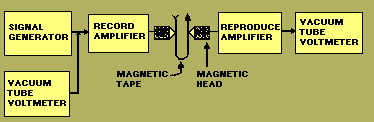 SIGNAL-TO-NOISE RATIO Signal-to-noise ratio (SNR) is the first magnetic tape recorder specification we'll describe. It's one of the most important specifications of a magnetic tape recorder. SIGNAL-TO-NOISE RATIO DEFINITION The SNR is the ratio of the normal signal level to the magnetic tape recorder's own noise level. It's measured in decibels (dB). In other words, the higher the SNR of a magnetic tape recorder, the wider the range of input signals it can properly record and reproduce. The noise part of the signal-to-noise ratio is generated in the magnetic tape recorder itself. Although noise can be generated by almost any part of the magnetic tape recorder, it's usually generated by either the magnetic heads or the magnetic tape. SIGNAL-TO-NOISE RATIO MEASUREMENT You can measure the SNR with a vacuum tube voltmeter (VTVM) and a signal generator. The equipment set up for measuring the SNR is shown in figure 6-1. After equipment setup, measure the SNR as follows: Figure 6-1. - Test equipment setup for measuring signal-to-noise ratio. Set the signal generator to inject a test signal into the tape recorder. The technical manual for the tape recorder you're testing will tell you how to set up the signal generator. While recording and reproducing, set the output level of the tape recorder's reproduce electronics to a level that displays 0-dB reference on the VTVM. Disconnect the signal generator. The voltage displayed on the VTVM will drop from 0-dB to some negative dB level. This level is the magnetic tape recorder's SNR. There are two things you should know when reading SNR specifications in technical manuals, equipment brochures, etc. First, the SNR is stated in three ways. You'll see it as (1) root-mean-square (RMS) signal-to-RMS noise, (2) peak-to-peak signal-to-RMS noise, or (3) peak signal-to-RMS noise. If the SNR specification doesn't state which way it was measured, you could be mislead. For example, a 25-dB RMS SNR is equal to a 34-dB peak-to-peak signal-to-RMS noise ratio, or a 28-dB peak signal-to-RMS noise ratio. Second, all SNR specifications should include the record level that was used. Since the SNR varies directly to the record level, you could be mislead by a SNR that doesn't include the record level of the test signal used when the SNR was measured. Frequency response The frequency-response specification of a magnetic tape recorder is sometimes called the bandwidth. A typical frequency-response specification might read within + / - 3 db from 100 Hz to 100 kHz at 60 ips. This means the magnetic tape recorder is capable of recording all frequencies between 100 Hz and 100 kHz at 60 inches per second (ips) without varying the output amplitude more than 3 dB. FREQUENCY-RESPONSE DEFINITION Frequency response is the amplitude variation with frequency over a specified bandwidth. Let's convert this to plain English. The frequency-response specification of a magnetic tape recorder tells you the range of frequencies the recorder can effectively record and reproduce. What exactly does the word effectively mean? That's hard to say because Frequency response varies from recorder to recorder, and from manufacturer to manufacturer. But a good rule of thumb is that an effective frequency-response specification tells the lowest and highest frequencies that the recorder can record and reproduce with no more than + / - 3-dB difference in output amplitude. FREQUENCY-RESPONSE MEASUREMENT The equipment setup for measuring the Frequency response of a magnetic tape recorder is the same as for measuring the signal-to-noise ratio. It's shown in figure 6-1. After equipment setup, measure a recorder's Frequency response as follows: