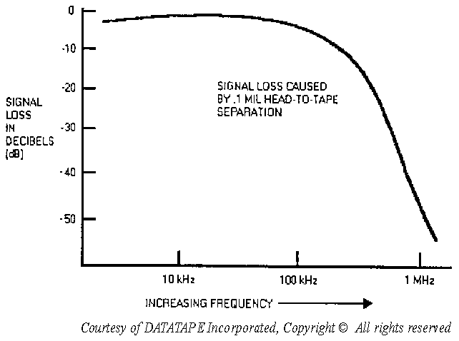 Poor tape-to-head contact can seriously degrade the record and reproduce process. Magnetic heads are designed to reduce tape-to-head gap as much as possible. A tape-to-head gap is extremely degrading at the higher frequencies. Figure 6-3 shows this. Note how a .1-mil gap causes only a small loss at 10 kHz. But, at 1 MHz, it causes a 46-dB loss! You must maintain tape-to-head contact. Keeping the magnetic tape recorder heads and tape transport clean is the best way to do this. Figure 6-3. - Effects of poor tape-to-head contact.