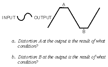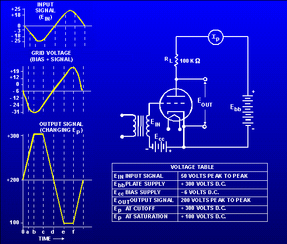 On the negative half of the input signal, the grid voltage is made more negative. This reduces plate current which, in turn, reduces the voltage drop across RL. The voltage between cathode and the plate is thereby increased. You can see these relationships by following time "a" through the three waveforms. Now, let's assume that this particular triode cuts plate current flow off when the grid reaches -24 volts. This point is reached at time b when Ein is -18 and the bias is -6 (-18 and -6 = -24). Plate current remains cut off for as long as the grid is at -24 volts or greater. With zero current flowing in the plate circuit, there is no voltage drop across RL. The entire plate-supply voltage, E bb (300 volts), appears as plate voltage between the cathode and the plate. This is shown at time b in the output signal waveform. Between time b and time c, the grid voltage is greater than -24 volts. The plate current remains cutoff, and the plate voltage remains at +300. The output waveform between time b and time c cannot follow the input because the plate voltage cannot increase above +300 volts. The output waveform is "flattopped." This condition is known as AMPLITUDE DISTORTION. When the grid voltage becomes less negative than -24 volts, after time c, the tube starts conducting, and the circuit again produces an output. Between time c and time d, the circuit continues to operate without distortion. At time e, however, the output waveform is again distorted and remains distorted until time f. Let's see what happened. Remember that every cathode is able to emit just so many electrons. When that maximum number is being emitted, the tube is said to be at SATURATION or PLATE SATURATION. Saturation is reached in a triode when the voltages on the grid and plate combine to draw all the electrons from the space charge. Now, as our grid becomes less negative (between time c and time d), and actually becomes positive (between time d and time e), the plate current increases, the voltage across RL increases, and the plate voltage decreases. Apparently when the grid voltage reached +12 volts at time e, the plate current reached saturation. Maximum plate current (at saturation) results in maximum voltage across RL and minimum plate voltage. Any grid voltage higher than +12 volts cannot cause further changes in the output. Therefore, between time e and time f, the plate voltage remains at +100 volts and the waveform is distorted. This is also AMPLITUDE DISTORTION. This has been an explanation of one cycle of an input signal that overdrives the tube. You should notice that, using the same circuit, a 50-volt peak-to-peak input signal caused a vastly different output from that caused by the 6-volt peak-to-peak input signal. The 6-volt peak-to-peak signal did not overdrive the tube. When the input signal was increased to 50-volts peak-to-peak, the tube was forced into cutoff when the grid was driven to -24 volts, and into saturation when the grid was driven to +12 volts (the grid voltage plus the signal voltage.) During these periods, the tube could not respond to the input signal. In other words, the output was distorted. A method commonly used to partially overcome distortion is to vary the bias voltage on the grid. The point at which the tube goes into cutoff or saturation can then be controlled. For this reason tube biasing is of great importance in most tube circuits. Q.20 The waveforms shown below are the input and output of an overdriven triode.