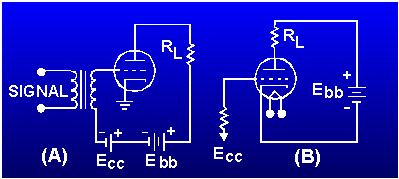 TYPES OF BIASING There are two main classes of biasing - FIXED and SELF. In a tube circuit that uses fixed bias, the grid-bias voltage is supplied from a power source external tothe circuit. You are already familiar with battery bias, which is one form of fixed bias.When fixed bias is used in a circuit, it can be represented as either a battery (fig.1-21, view A), or as a conductor connected to -E 3ecc (fig. 1-21, view B). Fixedbias is rarely used in electronics today. Therefore, we will not discuss it further.Figure 1-21. - Fixed bias: A. Battery B. Conductor