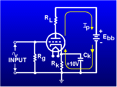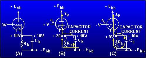 The only difference between the illustrated circuit and the one used to demonstrate triode operation is the elimination of the battery, E cc, and the addition of circuit components Rk, the cathode-biasing resistor; Ck, the cathode ac-bypass capacitor; and a grid resistor (whose purpose will be explained later). When the tube conducts, current flows from the battery through Rk to the cathode, through the tube to the plate, and through RL to the positive terminal of the battery. The current flowing through Rk will cause a voltage drop across Rk. The bottom of Rk goes negative while the top goes positive. This positive voltage at the top of Rk makes the cathode positive relative to the grid. You may wonder what purpose Ck serves in this circuit. Ck serves as an AC BYPASS. Without Ck, the bias voltage will vary with ac input signals. This is particularly troublesome in the higher frequencies like those found in radio receivers. Rk, the cathode-biasing resistor, is used to develop the biasing voltage on the cathode. The input signal will be developed across Rg. You will read more about the circuit component later in this chapter. Cathode-biasing voltage is developed in the following manner. As we mentioned earlier, the bias voltage will vary with the input unless Ck, the cathode bypass capacitor, is used. To understand how the bias voltage will vary with an ac input signal, disregard Ck for the moment and refer to figure 1-22 again. Notice that under quiescent conditions, the voltage drop at the top of Rk is +10 volts. Now let's apply the positive-going signal illustrated to the left of the tube. When the positive signal is applied, conduction through the tube will increase. The only trouble is that current through Rk will also increase. This will increase the voltage drop across Rk, and the cathode voltage will now be greater than +10 volts. Remember, at this time the plate is going negative due to increased conduction through the tube. The combination of the negative-going plate and the positive-going cathode will decrease the electrostatic attraction across the tube and lower the conduction of the tube. This will reduce the gain of the tube. When the negative-going signal is applied, conduction through the tube decreases. Current through Rk decreases and the voltage drop across Rk decreases. This causes the cathode to go more negative, which tends to increase conduction through the tube. A negative-going signal is amplified by decreasing plate current and allowing the plate to go positive (remember the 180 inversion.) Thus, increasing conduction on the negative half-cycle decreases the gain of that half-cycle. The overall effect of allowing cathode biasing to follow the input signal is to decrease the gain of the circuit with ac inputs. This problem can be overcome by installing Ck. The purpose of Ck is to maintain the cathode bias voltage at a constant level. In common usage, the action of Ck is referred to as "bypassing the ac signal to ground." The action of Ck will be explained using figure 1-23. View A shows the circuit under quiescent conditions. With some conduction through the tube, the cathode and the tops of Rk and Ck are at +10 volts. Figure 1-23. - Effect of the bypass capacitor.