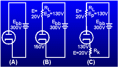 In view B, the positive-going signal is applied to the grid. This causes increased conduction through the tube, which attempts to drive the cathode to +20 volts. But notice that the top of Ck is still at +10 volts (remember capacitors oppose a change in voltage). The top plate of Ck is, in effect, 10 volts negative in relation to the top of Rk. The only way that Ck can follow the signal on the top of Rk (+20 volts) is to charge through the tube back to the source, from the source to the lower plate of Ck. When Ck charges through the tube, it acts as the source of current for the cathode. This causes the cathode to remain at +10 volts while the capacitor is charging. View C of the figure shows the same signal. Under these conditions, conduction through Rk will decrease. This will cause a decrease in current flow through Rk. Decreased current means decreased voltage drop. The top of Rk will try to go to +5 volts. Ck must now go more negative to follow the top of Rk. To do this, current must flow from C k through Rk, to the top plate of C k. This discharging of Ck will increase current flow through Rk and increase the voltage drop across Rk, forcing the top to go more positive. Remember, the voltage drop is due to current flow through the resistor. (The resistor could care less if the current is caused by conduction or capacitor action.) Thus, the cathode stays at +10 volts throughout the capacitor-charge cycle. There is one point that we should make. Ck and Rk are in parallel. You learned from previous study that voltage in a parallel circuit is constant. Thus, it would seem impossible to have the top of Rk at one voltage while the top plate of Ck is at another. Remember, in electronics nothing happens instantaneously. There is always some time lag that may be measured in millionths or billionths of seconds. The action of Ck and Rk that was just described takes place within this time lag. To clarify the explanation, the voltages used at the components Rk and Ck were exaggerated. Long before a 10-volt differential could exist between the tops of R k and Ck, Ck will act to eliminate this voltage differential. The capacitor, then, can be said to regulate the current flow through the bias resistor. This action is considered as BYPASSING or eliminating the effect of the ac input signal in the cathode. For all practical purposes, you can assume that ac flows through the capacitor to ground. But, remember, ac only appears to flow across a capacitor. In reality the ac signal is shunted around the capacitor. There are two disadvantages associated with cathode biasing. To maintain bias voltage continuously, current must flow through the tube, and plate voltage will never be able to reach the maximum value of the source voltage. This, in turn, limits the maximum positive output for a negative input signal (remember the 180 inversion). In addition, maximum plate voltage is decreased by the amount of cathode-biasing voltage. What this means is that you can't get something for nothing. If the cathode is biased at +20 volts, this voltage must be subtracted from the plate voltage. As an example, consider a triode with a 10,000 ohm plate resistor and a +300 volts dc source voltage. If a current of 2 milliamperes flows through the tube under quiescent conditions, 20 volts are dropped across the plate-load resistor. The maximum plate voltage is then 300 volts - 20 volts = 280 volts dc. Now, consider the 20-volt dropped across the cathode resistor. Plate voltage becomes 280 volts - 20 volts = 260 volts. To understand this a little more thoroughly, look at figure 1-24. In view A, the source voltage is 300 volts dc. There are two ways that this voltage can be looked at; either the plate is at +300 volts and the cathode is at 0 volts (ground), or the plate is at +150 volts and the cathode is at -150 volts. In electronics, it is common practice to assume that the plate is at +300 volts while the cathode is at 0 volts. To simplify this discussion, we will assume that the plate is at +150 volts, and the cathode is at -150 volts. The potential difference between the plate and the cathode is 300 volts. If a plate-load resistor is installed, as shown in view B, 20 volts are dropped by RL. The potential difference between the plate and the cathode is now 280 volts. In view C, Rk has now been placed in the same circuit. Rk drops 20 volts. Therefore, the effect of cathode biasing is to reduce the maximum positive signal that the circuit can produce. In this case, the maximum positive signal has been reduced by 20 volts. Despite these disadvantages, cathode biasing has two main advantages. It is simple and economical. Figure 1-24. - Loss due to cathode biasing.