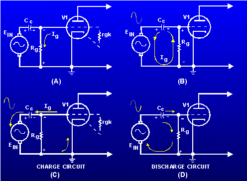 In summary, grid-leak bias causes the grid to draw current when the input signal goes positive. This grid current (which is a negative charge) is stored by the coupling capacitor (Cc,) which will keep the grid at some negative potential. It is this potential that biases the tube. Q.21 What type of bias requires constant current flow through the cathode circuit of a