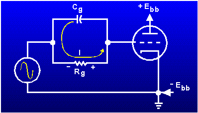 voltage causes the left-hand plate of C c to go positive. The left-hand plate must lose electrons to go positive. These electrons leave the left-hand plate of Cc and travel to the input source where they will be coupled to ground. From ground, current flows through Rg causing a negative (bottom) to positive (top) voltage drop across Rg.">