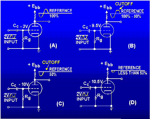 NEETS modules, some discussion of the classes of operation of an amplifier is needed at this point. This is because their operation class is directly determined by the bias voltage of the tube. The classification of amplifiers by operation is based on the percentage of the time that the tube conducts when an input signal is applied. Under this system amplifiers may be divided into four main classes: A, AB, B, and C. ">