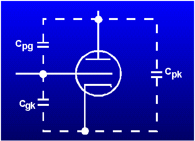 INTERELECTRODE CAPACITANCE As you know, capacitance exists when two pieces of metal are separated by a dielectric. You should also remember from your studies that a vacuum has a dielectric constant of 1. As the elements of the triode are made of metal and are separated by a dielectric, capacitance exists between them. This capacitance is called interelectrode capacitance, and is schematically represented in figure 1-29. Figure 1-29. - Schematic representation of interelectrode capacitance.