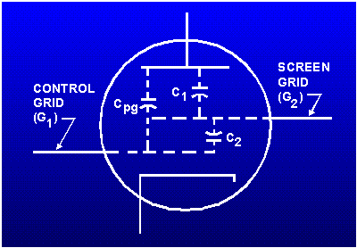 Notice that there are three interelectrode capacitances involved in a triode. The capacitance between the plate and grid, designated C pg, is the largest, because of the relatively large area of the plate, and therefore has the greatest effect on triode operation. The grid-to-cathode capacitance is designated Ckg. The total capacitance across the tube is designated C pk. As we said earlier, Cpg has the greatest effect on the tube operation. This is because this capacitance will couple part of the ac signal from the plate back to the grid of the tube. The process of coupling the output of a circuit back to the input is called FEEDBACK. This feedback affects the gain of the stage. It may be desirable in some applications. In others, the effects must be neutralized. The effects of Cpk are greater at higher frequencies where Xc is lower. DEVELOPMENT OF THE TETRODE Interelectrode capacitance cannot be eliminated from vacuum tubes, but it can be reduced. The easiest method found to reduce interelectrode capacitance is to split the capacitance between the grid and plate (Cpg) into two capacitors connected in series. This is done by placing an extra grid, called the SCREEN GRID, between the control grid and the plate. This is shown in figure 1-30. Figure 1-30. - Effect of the screen-grid on Interelectrode capacitance.