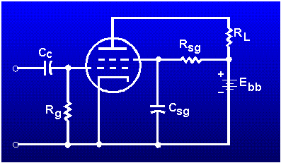 The addition of the screen grid has the effect of splitting C pg into two capacitances (C1 and C2) connected in series. Therefore, the total interelectrode capacitance between the control grid and the plate is greatly reduced. OPERATION OF THE BASIC TETRODE CIRCUIT Figure 1-31 depicts a basic tetrode circuit. While the circuit may look complicated, it isn't. You are already familiar with most of the circuit. Only three components have been added: the screen grid, the screen grid dropping resistor, and the screen grid bypass capacitor (Csg). Figure 1-31. - Basic tetrode circuit.