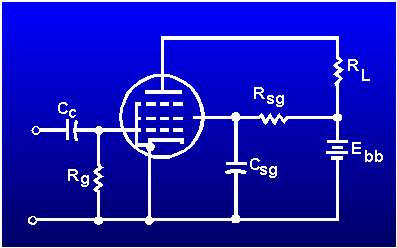 THE PENTODE The problem of secondary emission associated with the screen grid of a tetrode has been reduced by - you guessed it, the addition of another grid. This third grid, called a SUPPRESSOR GRID, is placed between the screen grid and the plate. The suppressor grid is normally connected either internally or externally to the cathode and bears the same charge as the cathode. This is shown in figure 1-33. Because of its negative potential (relative to individual electrons), any electrons that are emitted by the plate, through secondary emission, are repelled back toward the plate. Figure 1-33. - Basic pentode circuit.