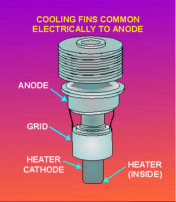 The plate of the tube consists of a cylindrical stud. This stud-plate construction has two purposes. Its flat lower surface serves as a parallel plate, and its external upper end serves as the external-plate connection from the tube to the circuit. Because of its construction, the planar tube cannot use the ladder-type grid, with which you are familiar. Instead, the grid, formed into a circle, is composed of a wire mesh similar to that of a common screen door. The cathode structure is manufactured in two parts. Point A of figure 2-13 is the metallic shell of the tube and is used to couple (or connect) unwanted radio frequency signals from the cathode to ground. This connection is not, however, a direct coupling. The wafer at point C of figure 2-13 is composed of mica, which serves as a dielectric. The lower extension of the cathode serves as one plate of the capacitor, while the other plate is formed from the flattened upper portion of the cathode connector ring. The cathode has a direct connection to the tube pin through the connector labeled point B. You might think that this is a rather complicated method to connect the cathode to a circuit, but it serves a purpose. At high frequencies, the wiring of a circuit can pick up radio frequency signals and retransmit them. If the wiring involved happens to be the wiring used to supply dc voltages to the circuit, all the tubes in the circuit will receive the signal. The result will be massive distortion throughout the circuit. The problem can be eliminated by isolating the dc and radio frequency circuits from each other. In planar tubes, this is fairly simple. The point A ring is grounded. Any rf signals that the cathode may pick up through tube conduction are grounded or shorted to ground through the capacitive coupling with the point A shell. In other words, the point A shell (capacitive ground) serves the same function as the bypass capacitor in a cathode-biased circuit. Because the capacitor will not pass dc, bias voltages can be applied to the cathode through the tube pins. Notice the external shape of the planar tube in figure 2-13. The tube is composed of five sections, or cylinders. As you go from the top to the bottom, each cylinder increases in diameter. Because of this piled cylinder construction, the tube resembles a lighthouse, and is therefore known as a LIGHTHOUSE TUBE. Another type of planar tube is shown in figure 2-14. This type of tube, because of its external appearance, is called an OILCAN TUBE. The major difference between it and the lighthouse tube is the addition of cooling fins to allow it to handle more power than the lighthouse tube. Because of their planar construction, both types of tubes are capable of handling large amounts of power at uhf frequencies. Figure 2-14. - Oilcan planar tube.