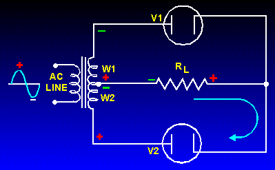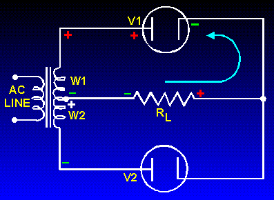 The Conventional Full-Wave Rectifier A full-wave rectifier is a device that has two or more diodes arranged so the load current flows in the same direction during each half cycle of the ac supply. A schematic diagram of a simple full-wave rectifier is shown in figure 3-8. The transformer supplies the source voltage for two rectifier tubes (V1 and V2). This power transformer has a CENTER-TAPPED high-voltage secondary winding that is divided into two equal parts (W1 and W2). W1 provides the source voltage for V1 and the other winding (W2) provides the source voltage for V2. The connections to the diodes are arranged so that the diodes conduct on alternate half cycles. Figure 3-8. - Simple full-wave rectifier (first alternation).