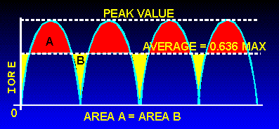 During the first half-cycle (as indicated by solid arrows) the plate of V1 is positive with respect to ground and the plate of V2 is negative. As shown, current flows from ground (center tap), up through the load resistor (RL), through diode V1 to point A. In the transformer, current flows from point A, through the upper winding and back to ground (center tap). When V1 conducts, it acts like a closed switch so that the positive half-cycle is felt across the load. During the second half-cycle (broken lines), the polarity of the applied voltage has reversed Now the plate of V2 is positive with respect to ground and the plate of V1 is negative. Only V2 can conduct. Current now flows, as shown, from ground (center tap), up through the load resistor (RL), through diode V2 to point B of T1. In the transformer, current flows from point B up through the lower windings and back to ground (center tap). Notice that the current flows across the load resistor (RL) in the SAME DIRECTION for both halves of the input cycles. The output waveform from the full-wave rectifier consists of two pulses of current (or voltage) for each cycle of input voltage. The ripple frequency at the output of the full-wave rectifier is therefore TWICE THE LINE FREQUENCY. The higher ripple frequency at the output of a full-wave rectifier has a distinct advantage: Because of the higher pulse frequency, the output is closely approximate to pure dc. This higher frequency also makes filtering much easier than the output of the half-wave rectifier. In terms of peak value, the average value of current and voltage at the output of the full-wave rectifier is twice as great as the average current or voltage at the output of the half-wave rectifier. The relationship between peak and average values is illustrated in figure 3-11. Figure 3-11. - Peak and average values for a full-wave rectifier.