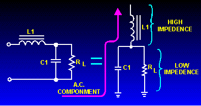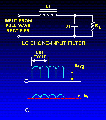 The larger the value of the filter capacitor, the better the filtering action. However, due to the physical size, there is a practical limitation to the maximum value of the capacitor. The inductor or filter choke (L1) maintains the current flow to the filter output (capacitor C1 and load resistance RL) at a nearly constant level during the charge and discharge periods of the filter capacitor. The series inductor (L1) and the capacitor (C1) form a voltage divider for the ac component (ripple) of the applied input voltage. This is shown in figure 3-30. As far as the ripple component is concerned, the inductor offers a high impedance (Z) and the capacitor offers a low impedance. As a result, the ripple component (Er ) appearing across the load resistance is greatly attenuated (reduced). Since the inductance of the filter choke opposes changes in the value of the current flowing through it, the average value of the voltage produced across the capacitor contains a much smaller value of ripple component (Er), as compared with the value of ripple produced across the coil. Figure 3-30. - LC choke-input filter (as voltage divider).