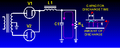 As a result, when the pulsating voltage is first applied to the LC choke-input filter, the inductor or filter choke (L1) produces a counter emf that opposes the constantly increasing input voltage. The net result is to effectively prevent the rapid charging of the filter capacitor (C1). Thus, instead of reaching the peak value of the input voltage, C1 only charges to the average value of the input voltage. After the input voltage reaches its peak and decreases sufficiently, the capacitor (C1) attempts to discharge through the load resistance (RL). C1 will attempt to discharge as indicated in figure 3-29. Because of its relatively long discharge time constant, C1 can only partially discharge. Figure 3-29. - LC choke-input filter (discharge path).